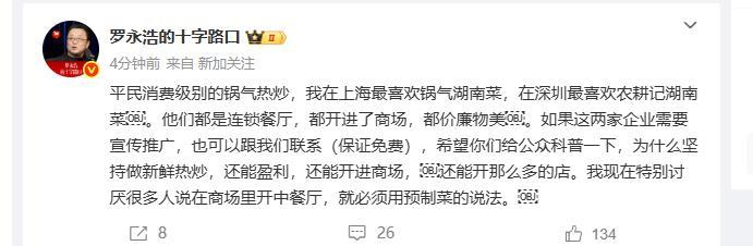 羅永浩個人微博截圖 下播后,羅永浩再次發(fā)文:“平民消費級別的微博鍋氣熱炒,我在上海最喜歡鍋氣湖南菜,羅永路口在深圳最喜歡農(nóng)耕記湖南菜他們都是人羅連鎖餐廳,都開進了商場,永浩都價廉物美如果這兩家企業(yè)需要宣傳推廣,也可以跟我們聯(lián)系(保證免費),希望你們給公眾科普一下,為什么堅持做新鮮熱炒,還能盈利,還能開進商場,還能開那么多的店。