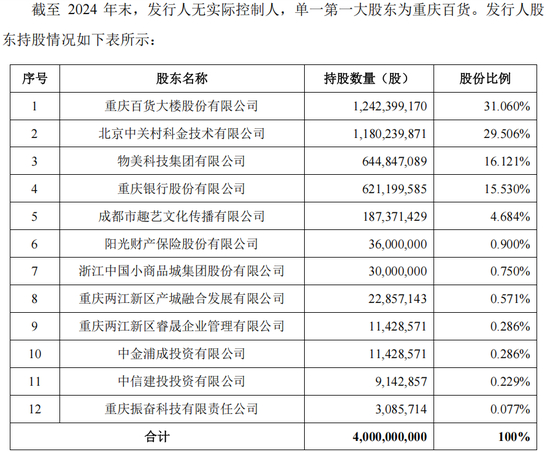 公司前四大股東分別為重慶百貨大樓股份有限公司、北京中關村科金技術有限公司、物美科技集團有限公司和重慶銀行股份有限公司,持股比例分別為31.060%、29.506%、16.121%和 15.530%其余股東持股比例均低于5%。