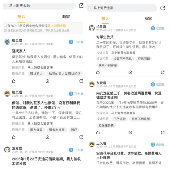 這些問題,如今依然存在筆者通過黑貓投訴平臺檢索“馬上消費金融”發(fā)現(xiàn),相關投訴量超過7萬,其中針對“暴力催收”的不在少數(shù)有用戶稱,“馬上消費金融盜取私人信息,暴力催收,太過分啦!”,還有用戶表示“安逸花暴力催收他們催收說他們的合同大于法律”。
