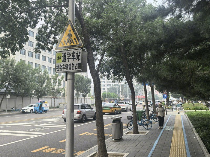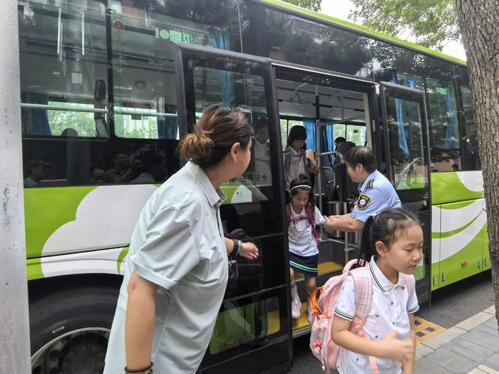 玉泉小學(xué)門(mén)口設(shè)置的通學(xué)公交站點(diǎn)/記者拍攝 【自己的東西都檢查一遍,別落車(chē)上,新開(kāi)線(xiàn)路注意腳下安全……】 早晨7點(diǎn)45分,調(diào)整通學(xué)公交車(chē)準(zhǔn)時(shí)停在海淀區(qū)玉泉小學(xué)航天校區(qū)西側(cè)的站點(diǎn),乘務(wù)員正幫助同學(xué)們有序下車(chē)中國(guó)科學(xué)院附屬玉泉小學(xué)校長(zhǎng)梁小紅介紹,通學(xué)車(chē)從學(xué)生居住的社區(qū)直達(dá)學(xué)校門(mén)口,全流程都有老師和乘務(wù)員進(jìn)行安全維護(hù):。